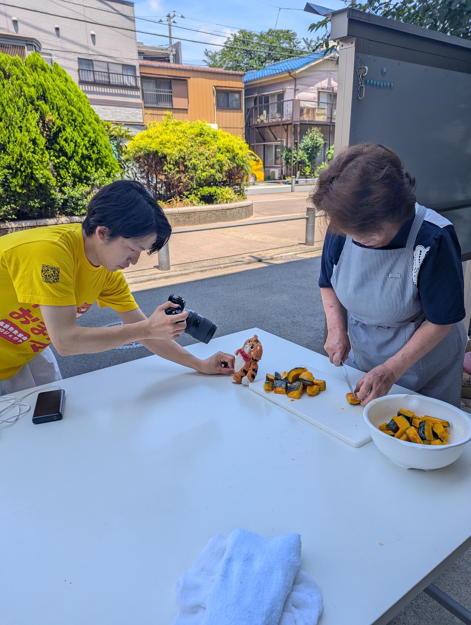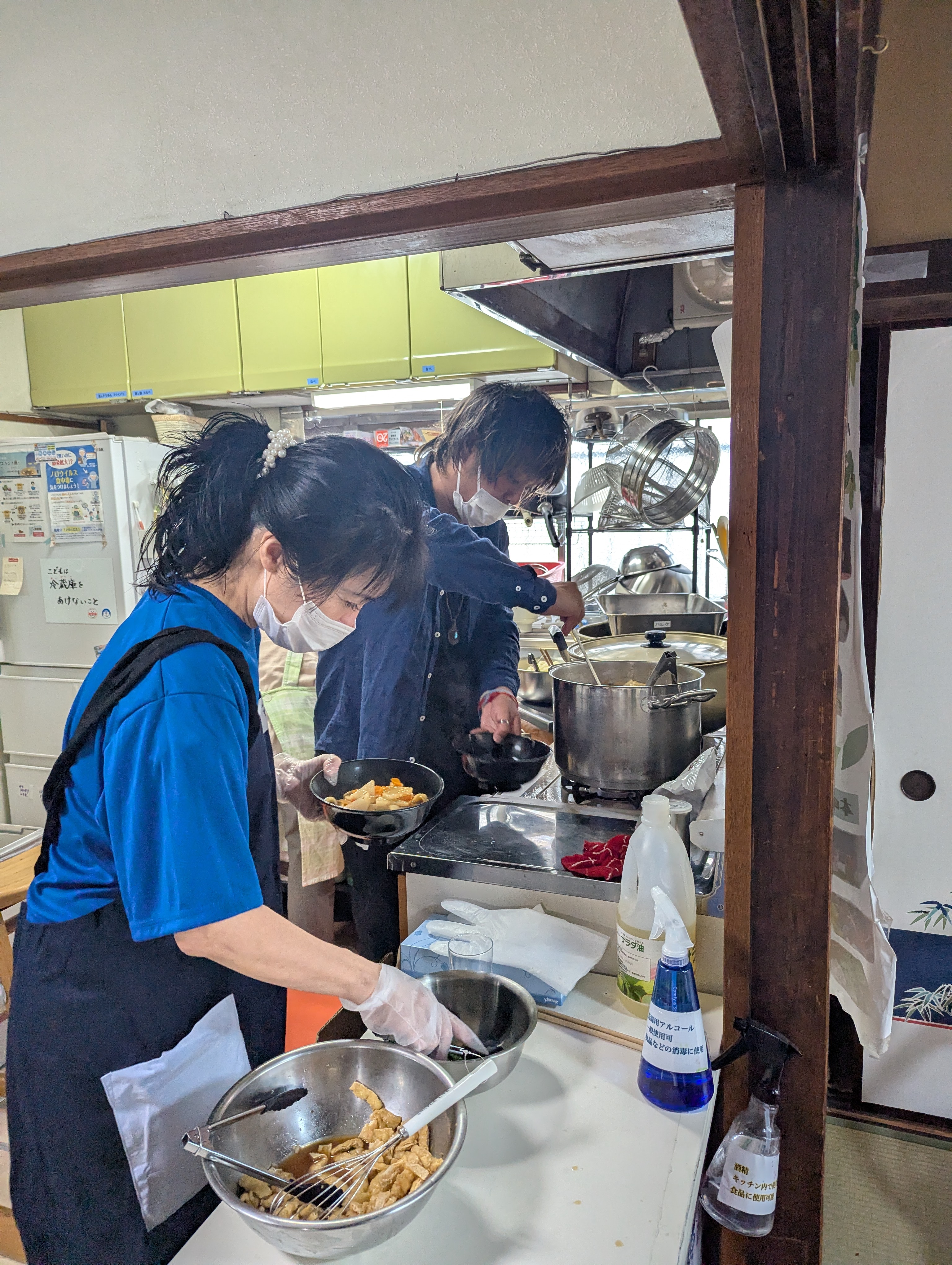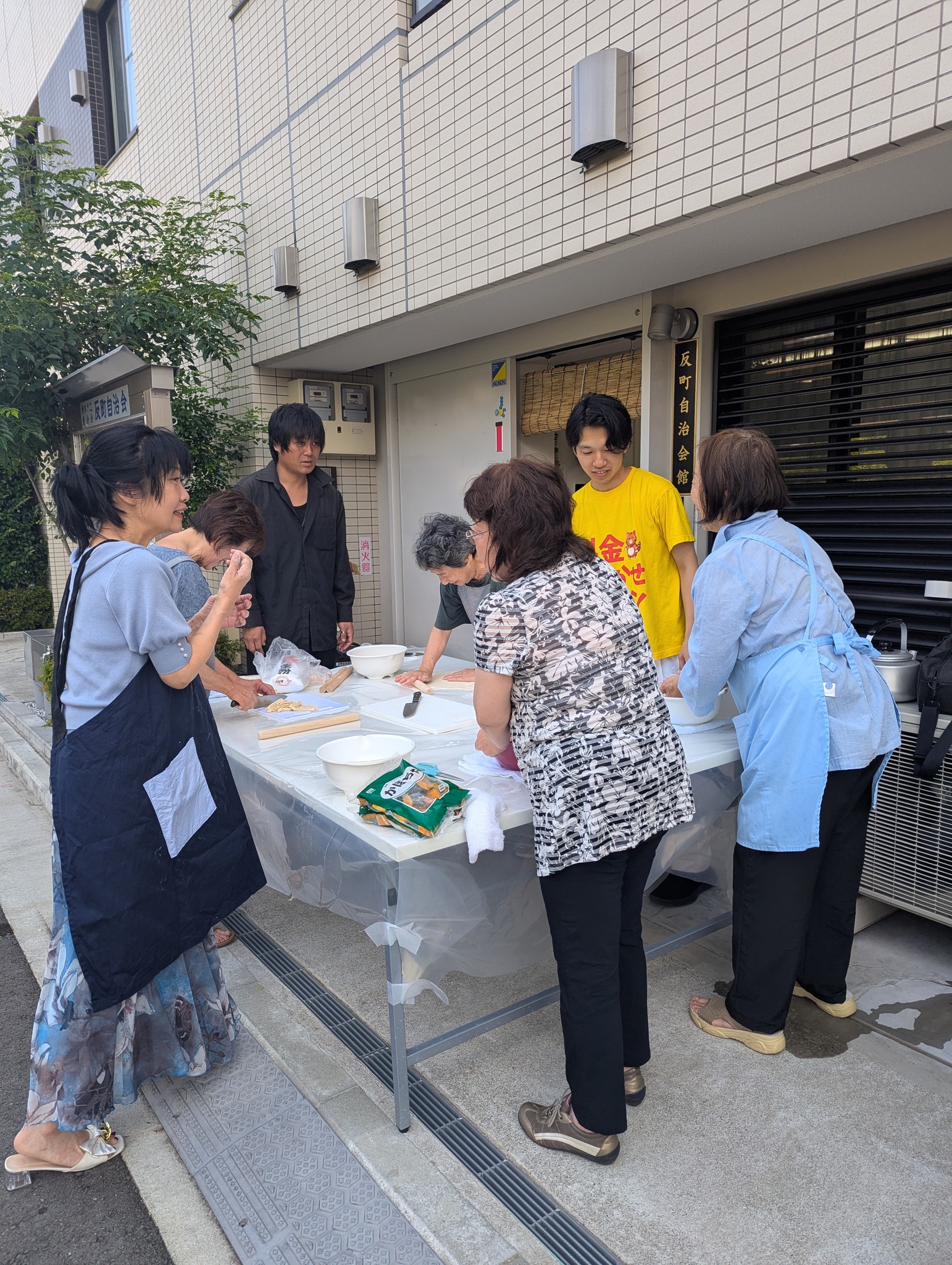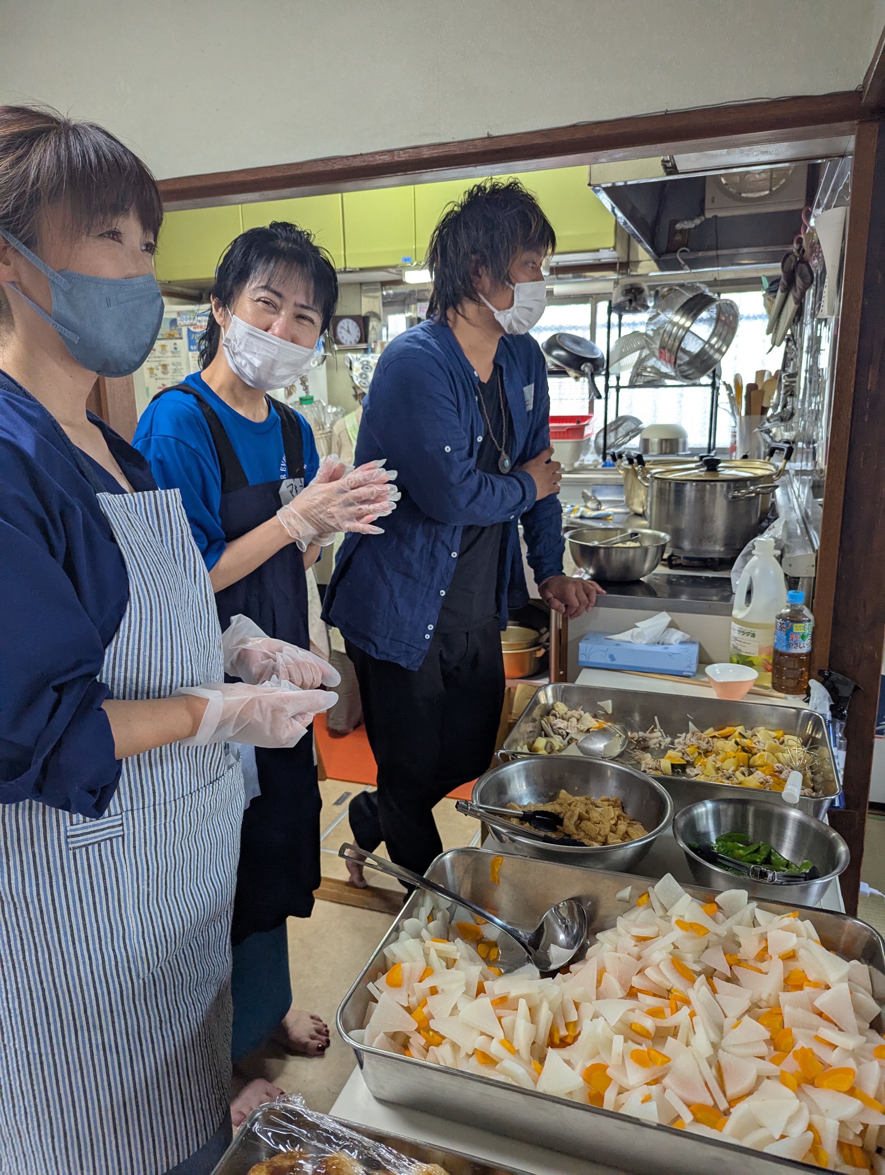 弊会スタッフと一緒に、ほうとうで近隣の高齢者と子供たちに提供